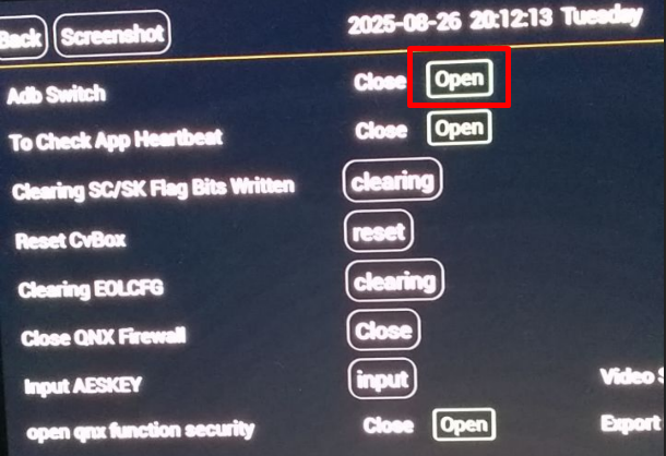 To enable ADB in the engineering menu, press "USB2.0" and then press the "DEVICE" button: